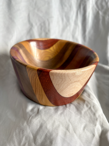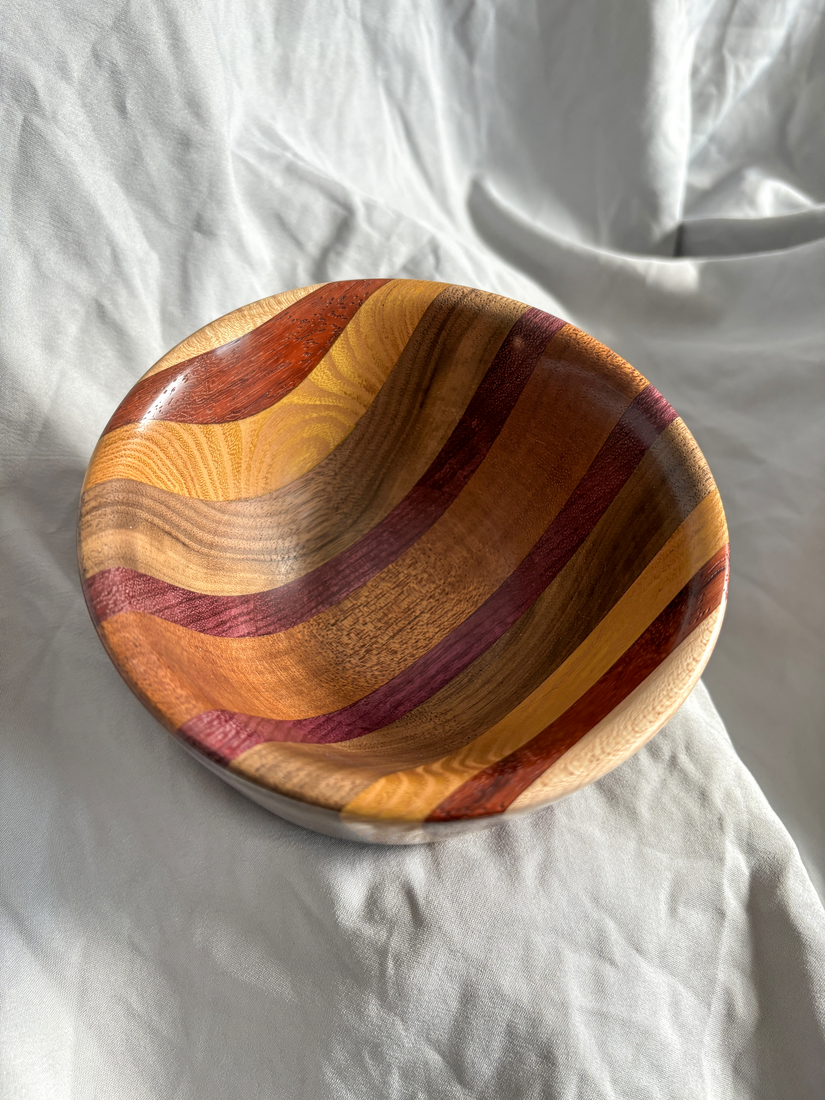 This is a stunning hand-turned bowl made from a variety of laminated woods, including padauk, purple heart, mahogany, walnut, maple, and osage. The bowl measures approximately 3 inches tall by 5.5 inches in diameter and is finished with an all-natural wax.