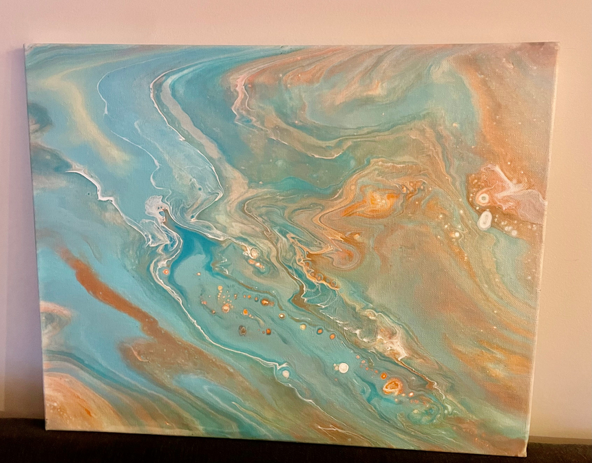 Back to ItemsThis is a 16" x 20" canvas - Gentle waves of ocean blue roll across the canvas, mingling with soft coral hues that glow like sunlight beneath the sea’s surface. White crests drift through the flow — light, airy, and full of motion — capturing the rhythm of a tranquil shoreline at dawn. The colors ebb and blend like a slow exhale, evoking the calm pull of the tide and the tender balance between sea and sky. It’s a quiet moment suspended in color — serene, fluid, and endlessly soothing.
