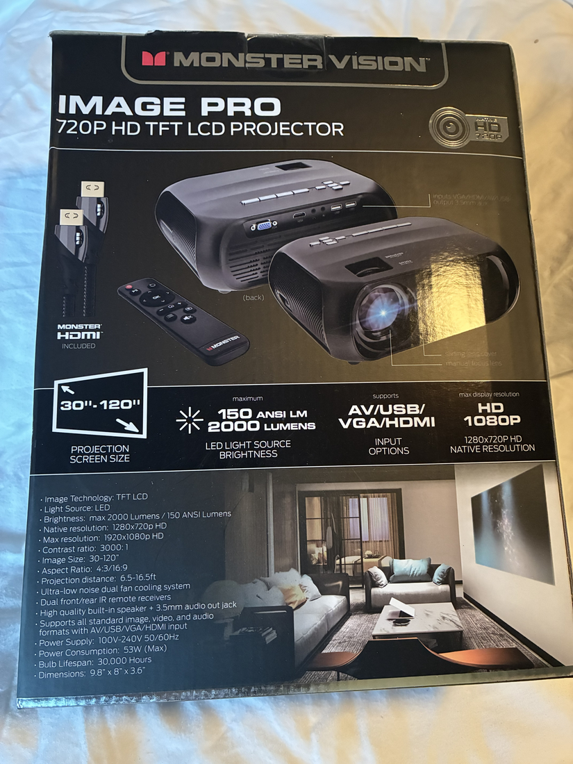 Back to ItemsWhen it comes to presentations and movie nights, you need a projector that can handle all your needs. With the Monster Image Pro 720P HD TFT LCD Projector, you’ll have an effective way to present whatever you want. Able to project up to 16 feet, the LED light source reaches 2000 lumens for a bright and satisfying experience. Working with every standard image, video and audio format, the AV/USB/HDMI input can easily manage all of them. You also have a max scalable resolution up to 1080 HD from it’s native 720 standard. Enjoy movie night the right way with the Image Pro 720P HD LCD Projector. Donated by R.C. Wiley.
