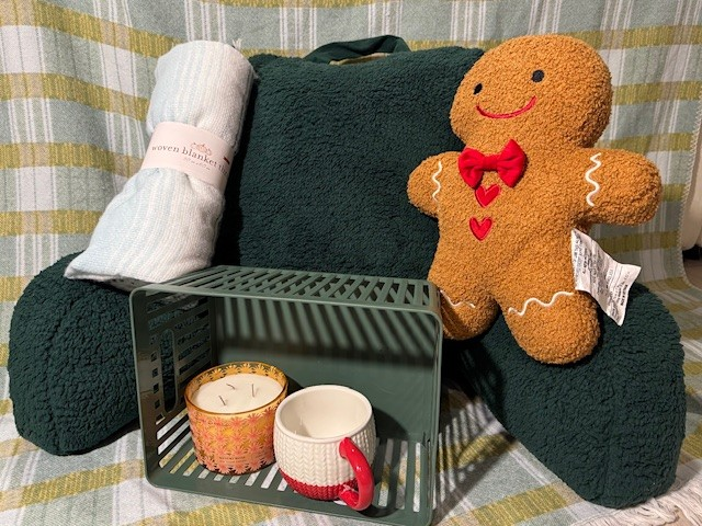 Back to ItemsCozy up in style this season with this comfort bundle! This auction offering includes a plush green bed rest pillow for lounging like royalty, a 50x60-inch woven throw blanket to keep you warm, and a festive red-and-white mug perfect for sipping your favorite holiday drink. Add a dash of whimsy with an adorable gingerbread man plush, and set the mood with a Desert Rose Wicked candle that fills the room with soothing fragrance. It’s the perfect recipe for relaxation and holiday cheer—bid now and make your space merry and bright!